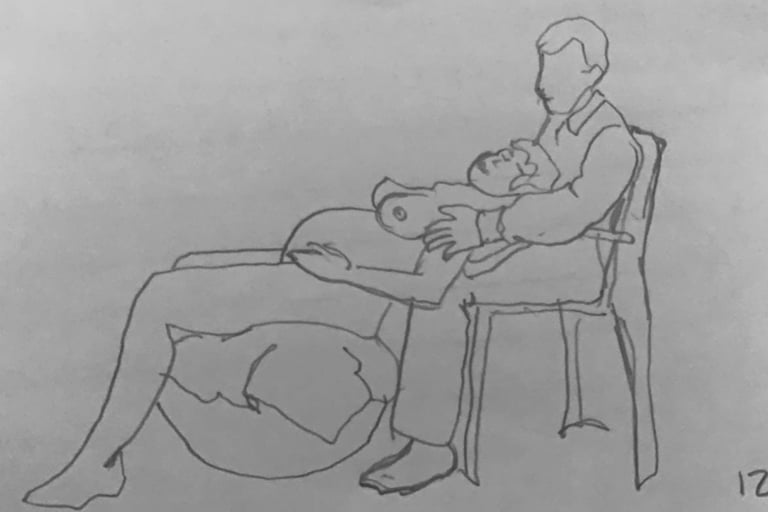 Se apoiar na parede ou no parceiro → inclinar-se para frente durante a contração alivia a pressão lombar. Além disso, o contato físico com quem acompanha traz segurança emocional e sensação de acolhimento.